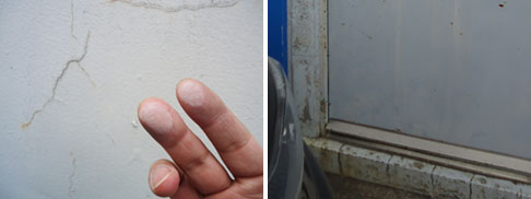 工場は外壁の傷みが進みがちですが、外壁はパリパリと剥がれていて基礎部分はクラック、それも破砕してしまっています。
